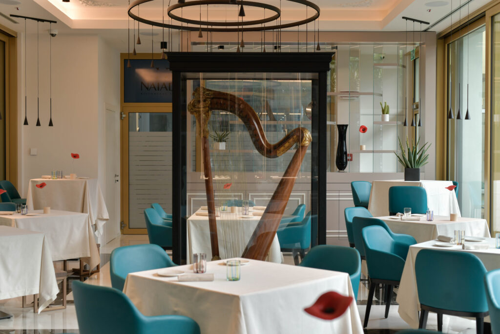 Punto di forza dell’hotel è anche l’aspetto culinario. Sontuose le prime colazioni con proposte dolci e salate, laute le cene con scelta di tre primi e tre secondi e ampia selezione di antipasti e verdure a buffet. Per una serata elegante e intima c’è il ristorante Naiade, aperto da giovedì a domenica, con soli 20 posti e con la maestria di Andrea Rossetti. Qui i piatti da scegliere per trasformare il soggiorno termale in un’esperienza gastronomica a due sono gli spaghetti con cicale di mare e caviale, e il rombo con zabaione all’alloro. Per chiudere la serata con musica dal vivo si può prenotare un tavolino al James Bond Bar, posto perfetto per un cocktail.