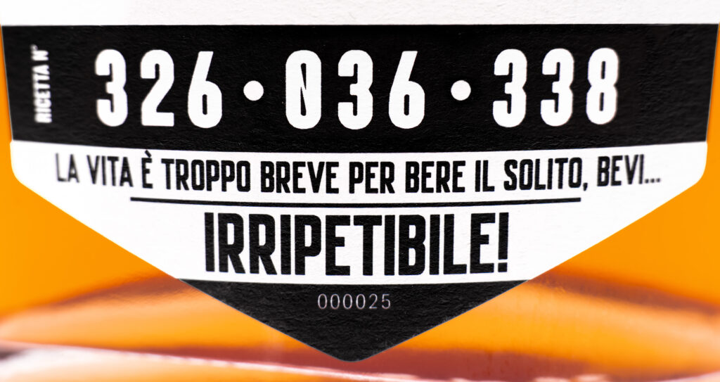 L’idea è questa: prendi tre basi di gusto – bitter, speziato, morbido – e dati gli ingredienti ricavane 250 mila combinazioni diverse. Un algoritmo. A fare la differenza può essere anche la variazione di pochi millilitri di un solo componente, e un palato raffinato la coglierà. Da queste 250 mila combinazioni, nascono 250 mila bottiglie: ognuna diversa dall’altra e non c’è trucco né inganno. A certificare la differenza è l’etichetta che riporta in un codice in bella vista la combinazione degli ingredienti: saranno i bartender a decifrarla, e a sapere esattamente cosa stanno utilizzando nel cocktail (irripetibile) che stanno realizzando, o nel drink on the rocks che stanno mettendo nel bicchiere.