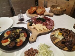 Nella piazza del paese anche Luca Malench usa fuoco e fumo, ma per conservare i suoi salumi. «Trucioli di faggio e ramaglie di ginepro sono la base per l’affumicatura dei nostri salumi, dallo speck alla mortandela, un impasto di carne suina avvolto nell’omento» spiega il mastro macellaio. Chi vuole assaporare la “mortandela storica” sceglie la macelleria di Massimo Corrà a Còredo.
