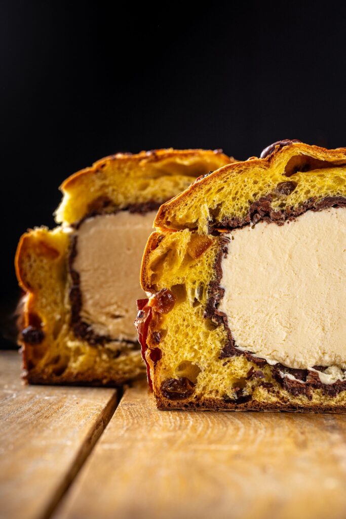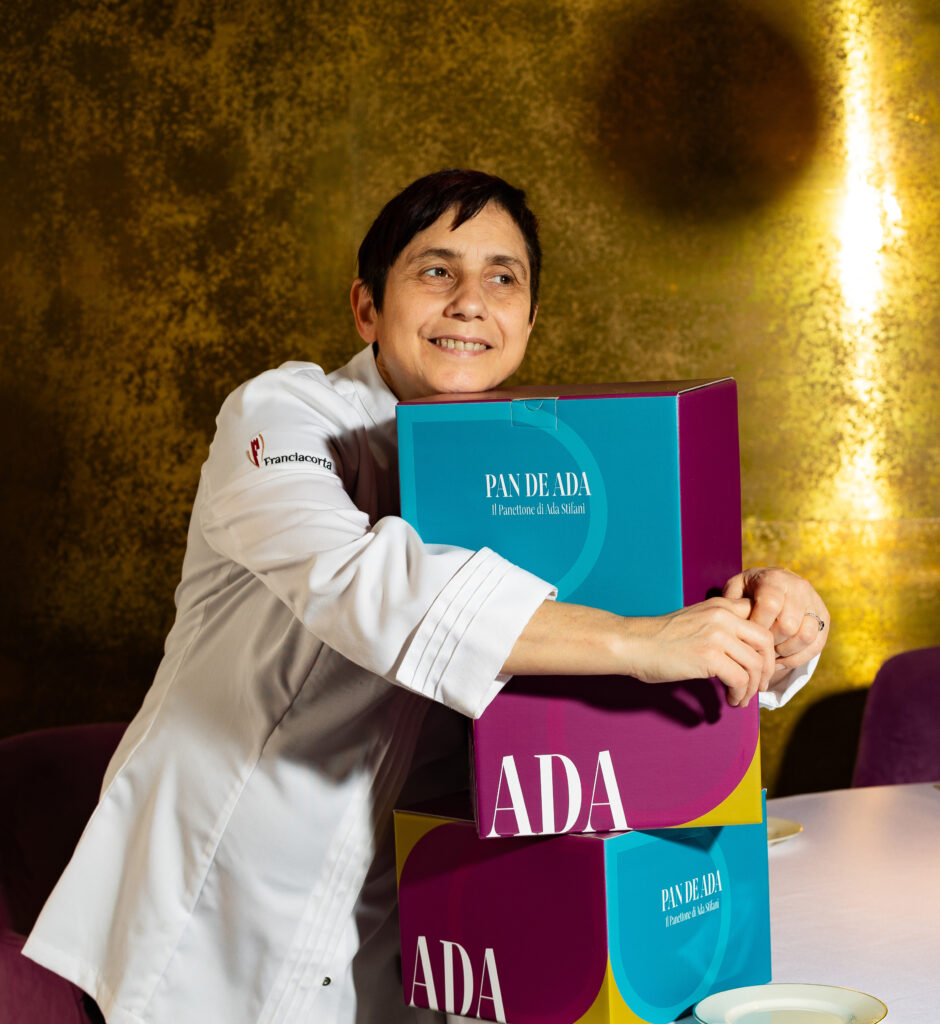 A Perugia la chef stellata Ada Stifani reinterpreta uno dei simboli dolciari del suo territorio: la Ciaramicola, il dolce perugino simbolo di festa e rinascita. Il suo “Pan de Ada” è un panettone che porta questa identità in una nuova dimensione: impasto soffice da lievitazione naturale di oltre 48 ore; bagna leggera all’Alchermes che conferisce il caratteristico aroma floreale e speziato; copertura di meringa italiana, candida e setosa, cotta quel tanto che basta per mantenere morbidezza; finitura con trucioli di cioccolato colorato che riprendono le decorazioni del dolce originario.