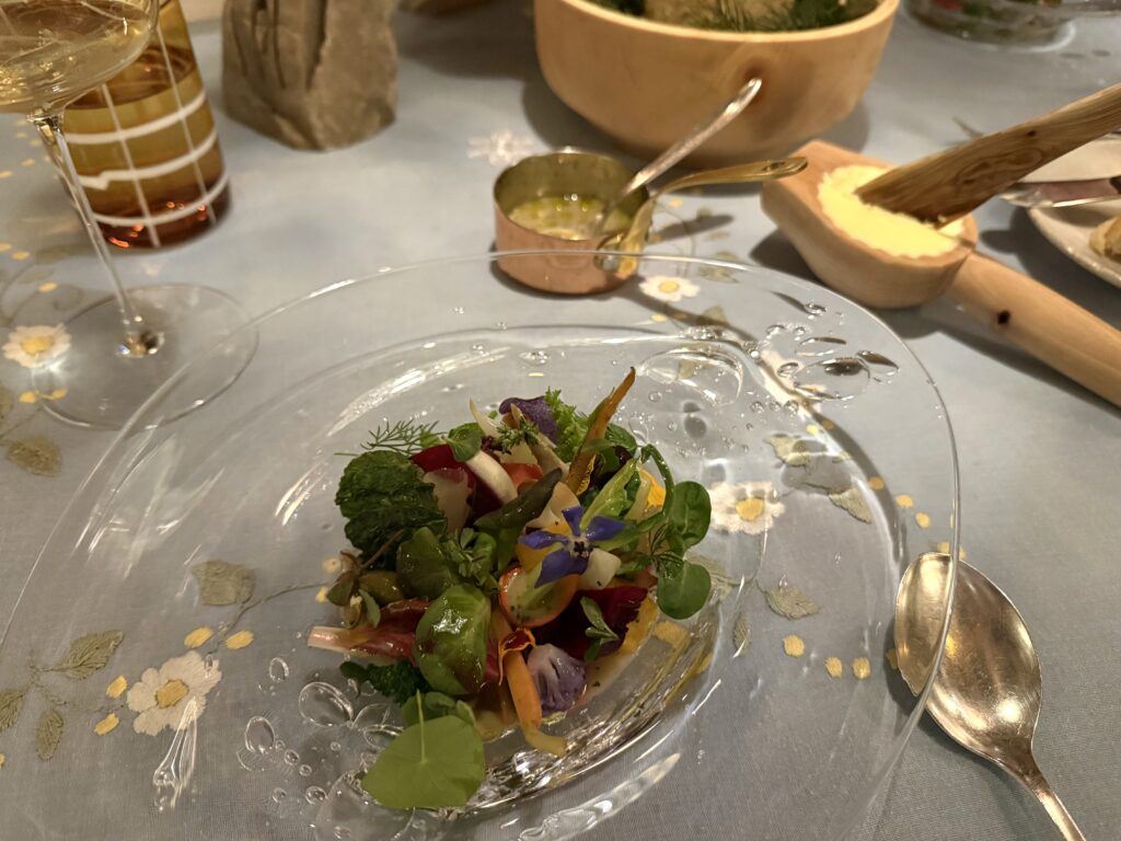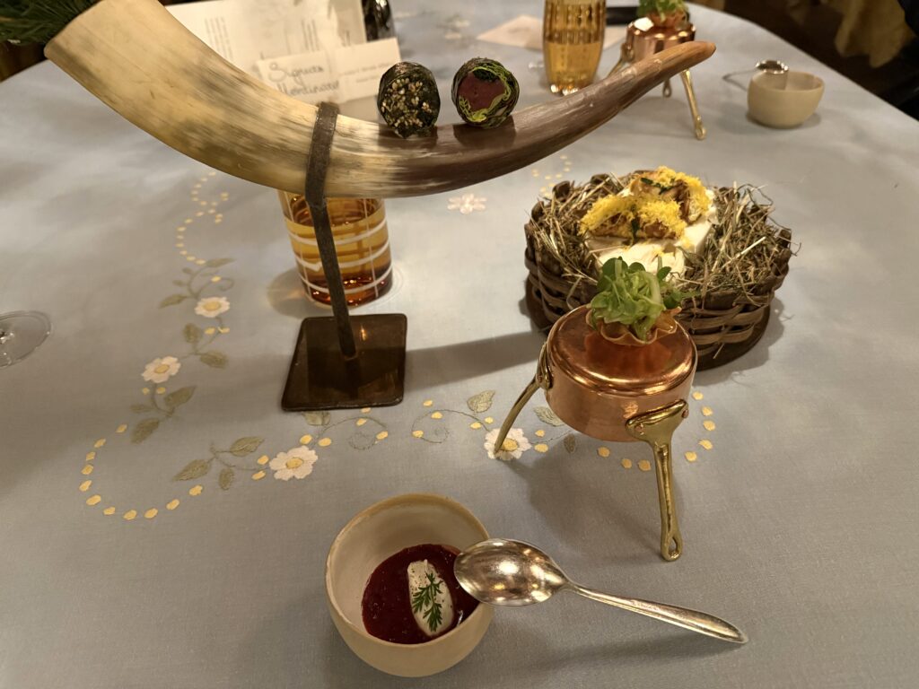 Chapeau di fronte al piatto più complesso, dal punto di vista della lavorazione (sono necessarie quattro ore per comporlo), della serata: il “Tributo a Michel Bras”: composizione di oltre cinquanta vegetali di stagione (verdure, foglie, erbe, germogli), ognuno lavorato diversamente, con finocchi, citronette all’arancia e ostriche.