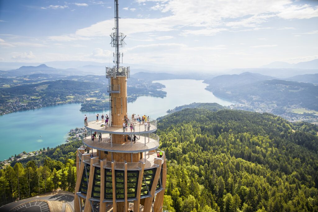Il punto di partenza ideale per questa ascesa non può che essere il Pyramidenkogel, la torre panoramica prodigio di architettura. Con i suoi cento metri di altezza, è la torre in legno più alta del mondo, una spirale che sembra danzare sopra il Wörthersee. Salire i suoi 441 gradini (o affidarsi al rapido ascensore trasparente) è un rito di passaggio: a ogni piano la prospettiva muta.