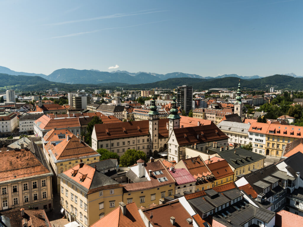 Non da meno è l’esperienza a Klagenfurt. Il campanile di St. Egyd offre una piattaforma a 50 metri d’altezza che regala una vista privilegiata sulla pianta ortogonale del centro storico, permettendo di scorgere in lontananza il profilo del Drago Lindwurm, simbolo della città, e l’inizio del canale che conduce al Wörthersee.