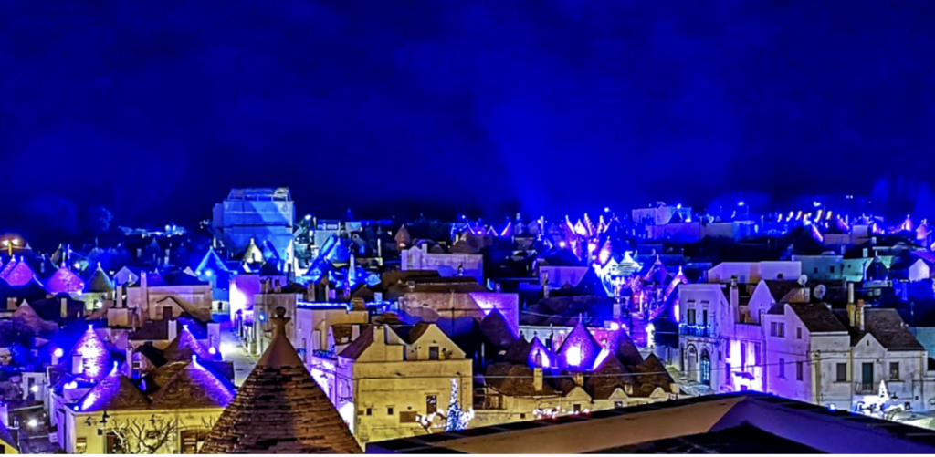Ad Alberobello, il Natale è una questione di meraviglia. I trulli, con i loro coni, sembrano nati per reggere la festa: diventano lanterne, quinte teatrali, superfici su cui la luce si diverte a disegnare.
