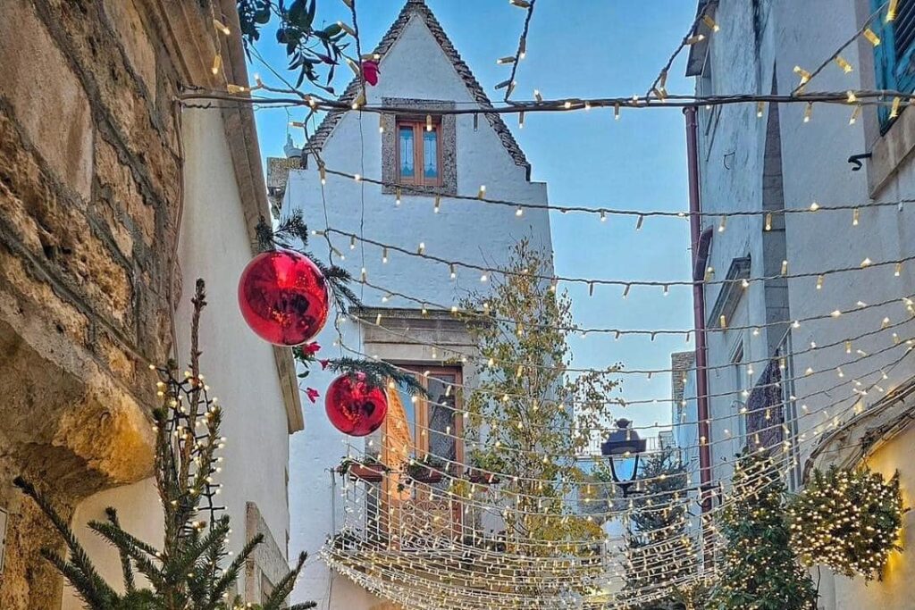 C’è un Natale, in Puglia, che non ha bisogno di effetti speciali. Gli basta la pietra bianca che riflette le luci, un vicolo che profuma di legna e zucchero, una porta socchiusa da cui scappa un “entra, fa freddo”.