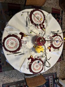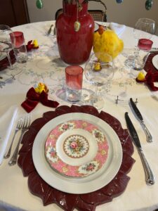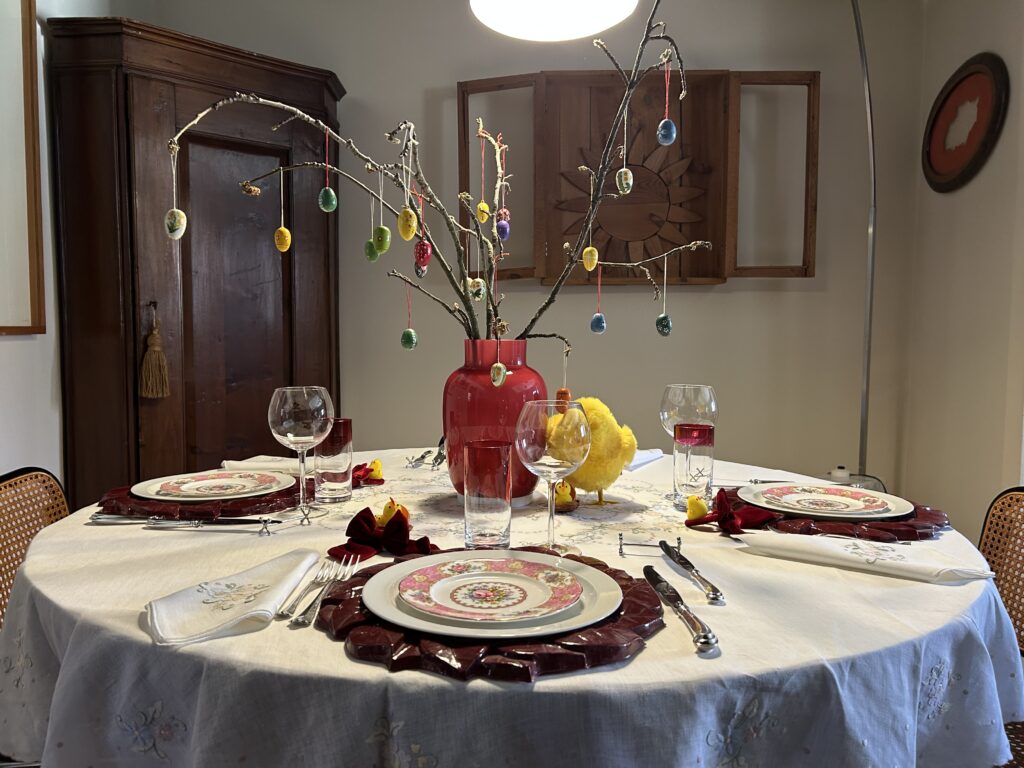 Nelle foto, c’è un ricordo personale: è il tavolo che ho preparato per una Pasqua in famiglia e che magari vi può ispirare. In questo caso, non avevo voluto usare i fiori ma avevo scelto di realizzare il centrotavola con gli ovetti di legno decorati a mano che la mia nonna austriaca mi regalò quando ero ragazza. Pensando ai bambini, avevo aggiunto il pulcino “morbidoso”. I piattini dell’antipasto sono parte di una vecchia collezione inglese.